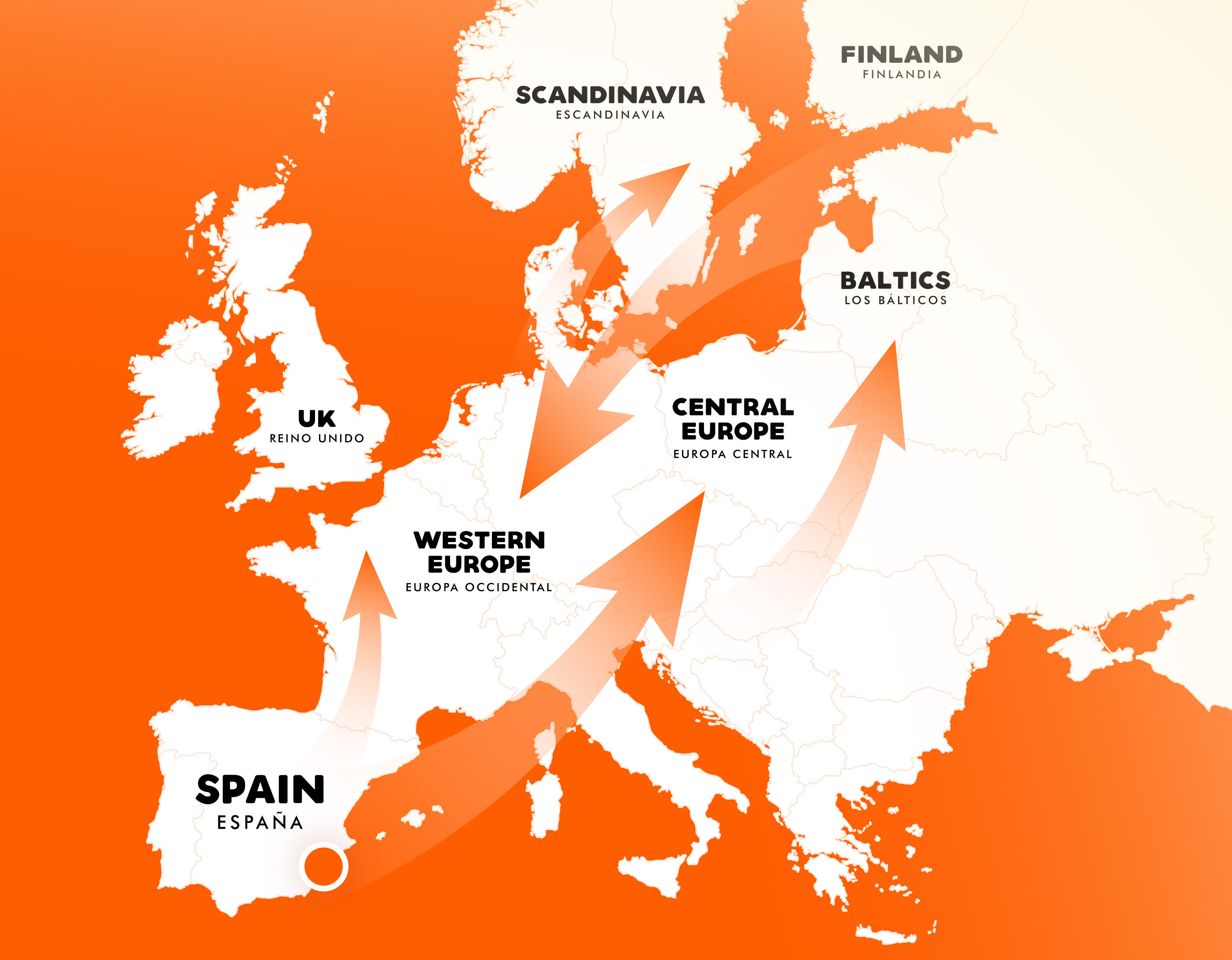 Our operations are strategically centered in Spain, serving as the gateway to a broad network across Europe. From our base in Spain, we extend our reach to key regions including the United Kingdom (UK), Western Europe, Central Europe, Scandinavia, the Baltics, and Finland. These areas represent our core destinations, enabling strong connectivity and efficient service throughout Northern, Central, and Western Europe.